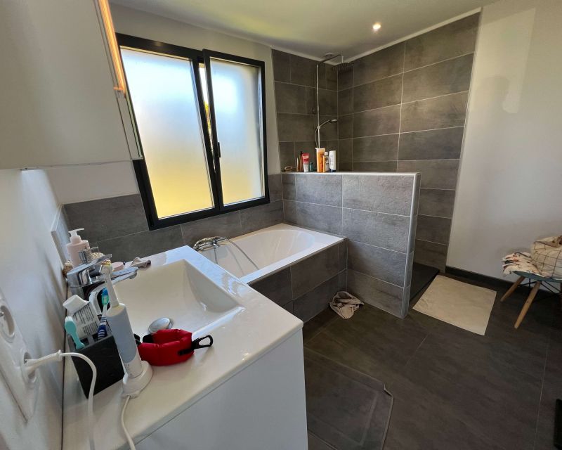 - Au rez-de-chaussée : salon séjour, cuisine ouverte équipée, salle de bains et douche.
