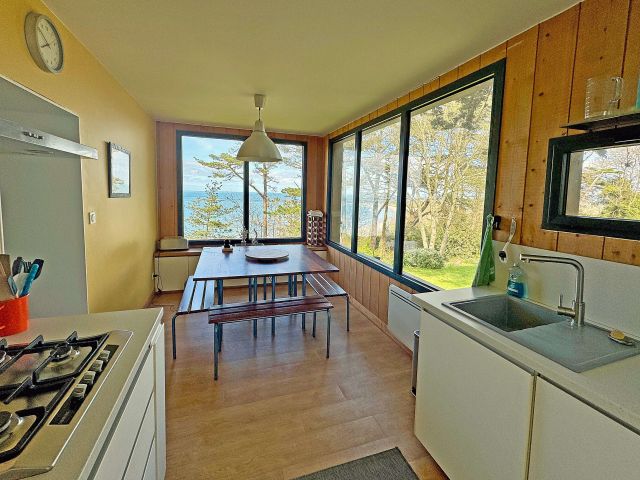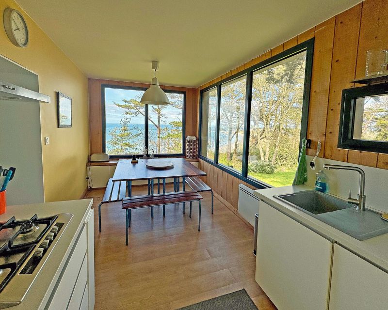 Dès l’entrée, le ton est donné : une cuisine dînatoire entièrement aménagée et équipée, pensée pour la convivialité, où chaque repas s’accompagne d’une vue mer panoramique.