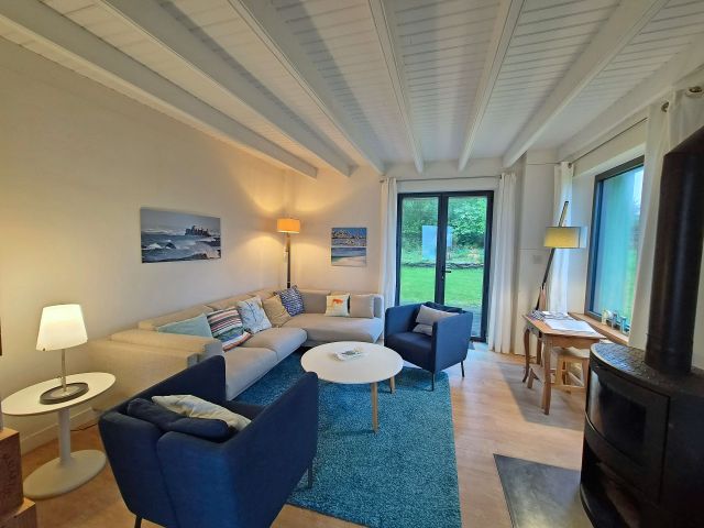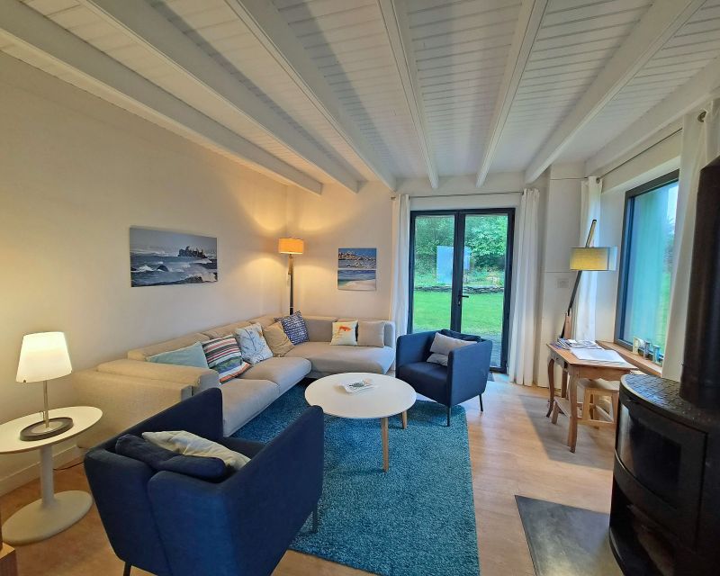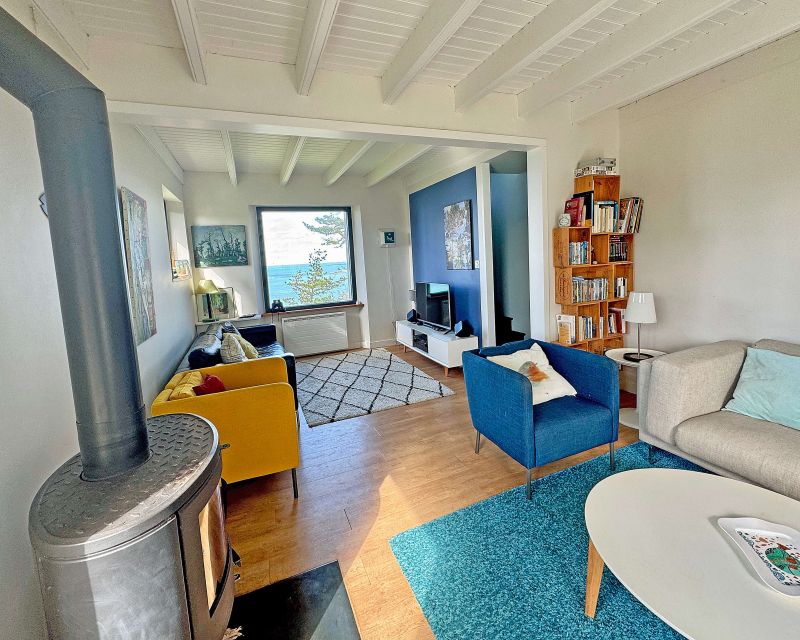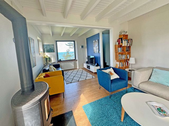 Le vaste salon-séjour, baigné de lumière, prolonge cette perspective azur et vous invite à la détente au coin du poêle à bois. Le rez-de-chaussée offre également le confort d’une vie de plain-pied avec une chambre disposant de sa salle d’eau et d'un wc indépendant.