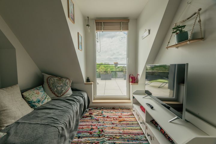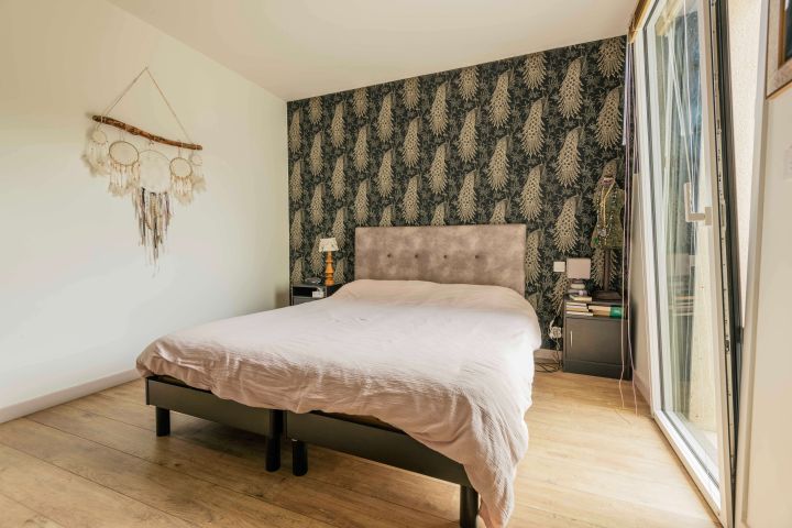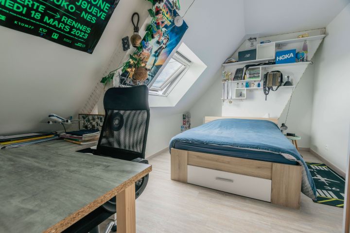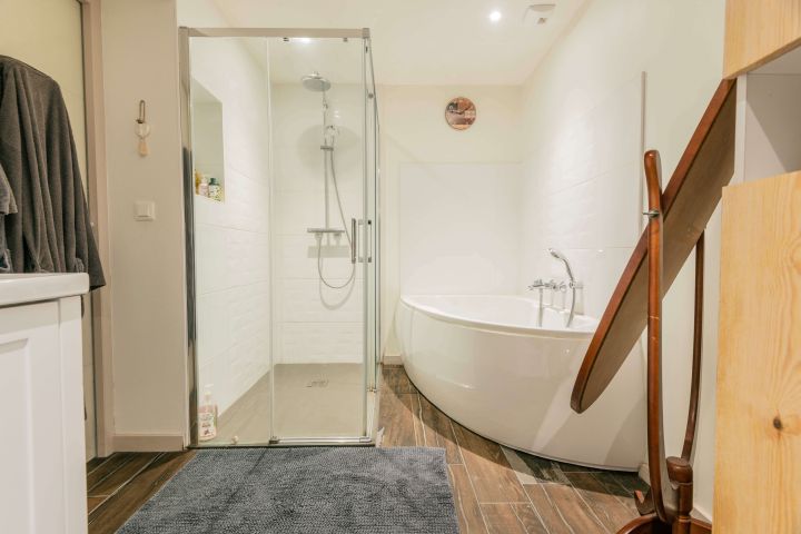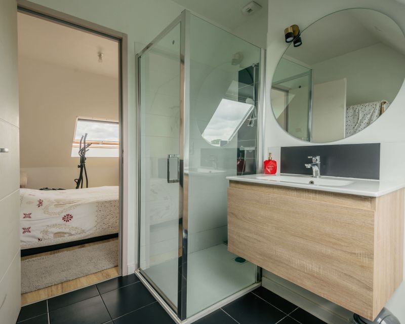 Le rez-de-chaussée s’organise autour d’un vaste séjour d’environ 54 m², agrandi par une extension récente et ouvert sur une terrasse exposée plein sud. Cet espace lumineux accueille un salon et une salle à manger en lien direct avec l’extérieur. La cuisine ouverte, entièrement aménagée et équipée, s’intègre naturellement à l’ensemble, tandis qu’une entrée indépendante permet de préserver une séparation fonctionnelle avec les espaces de vie.