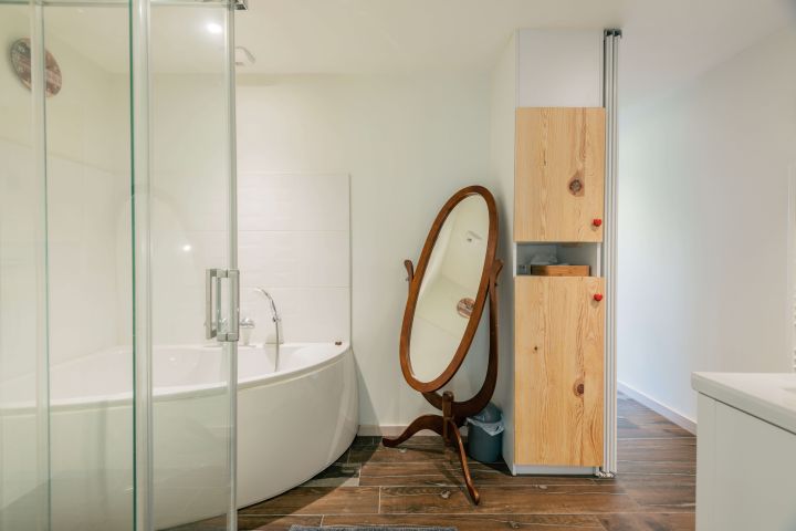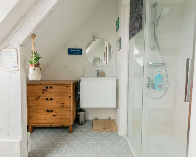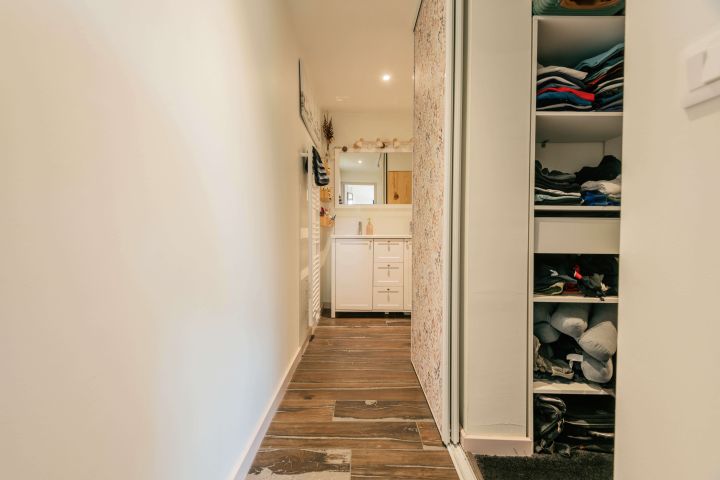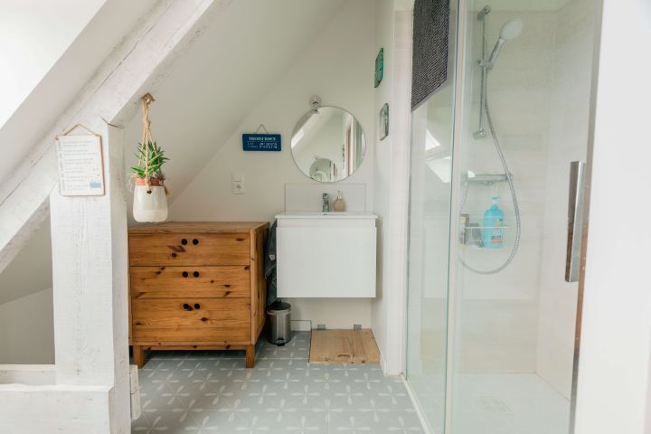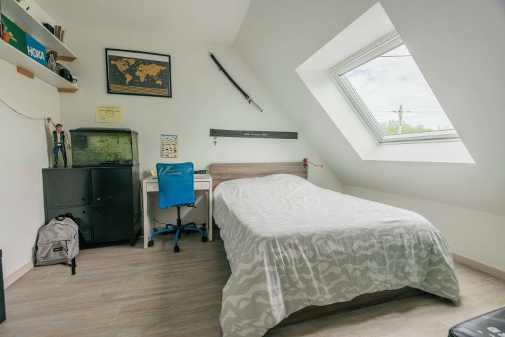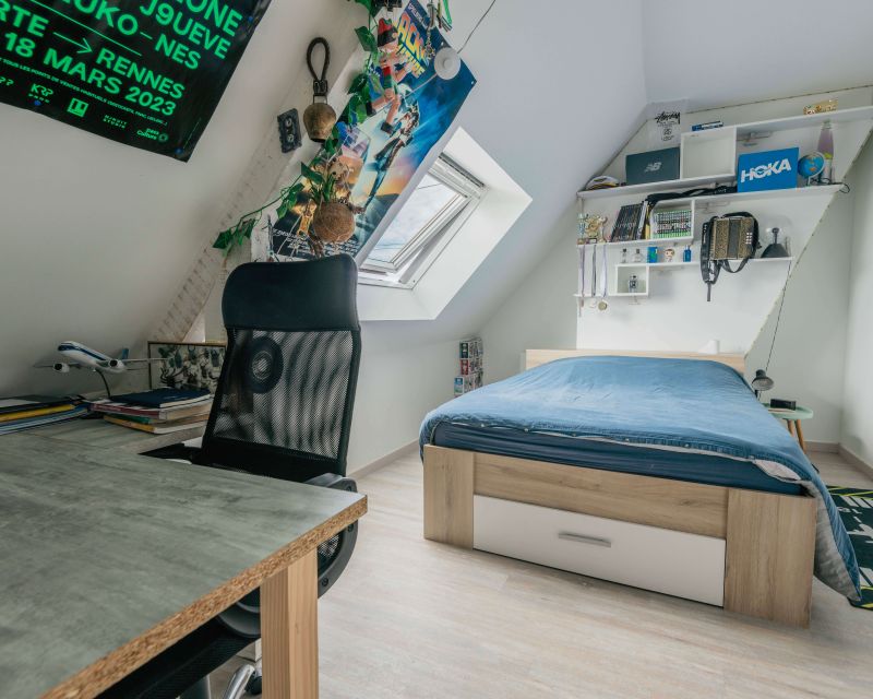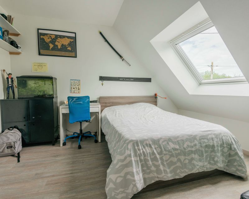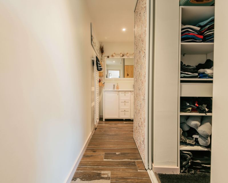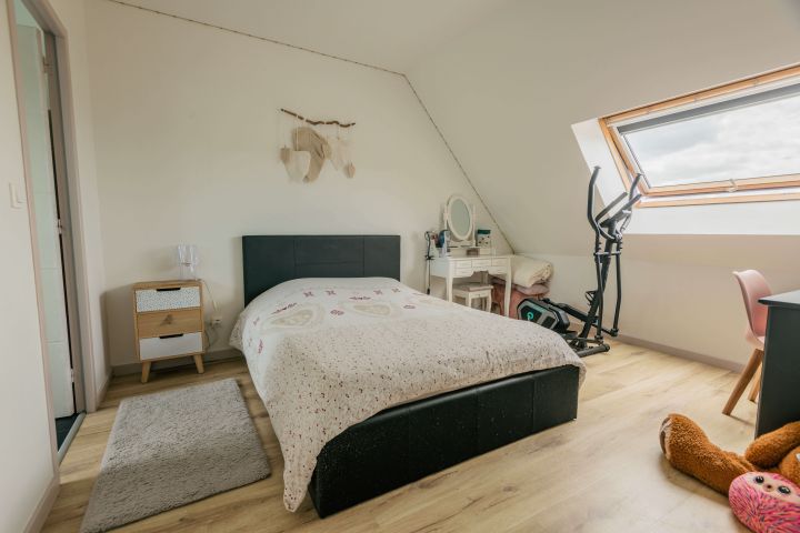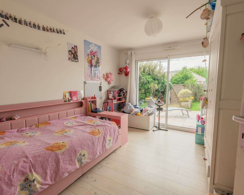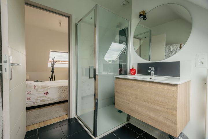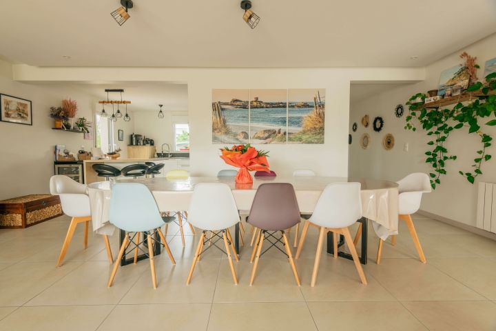 La maison propose plusieurs espaces nuit répartis sur deux niveaux. Le rez-de-chaussée comprend deux chambres, dont une suite avec dressing et salle de bains privative, permettant une vie de plain-pied. À l’étage, un palier aménageable en espace détente dessert trois chambres supplémentaires, dont deux orientées vers la mer, ainsi que deux salles d’eau et des WC. L’ensemble offre une configuration adaptée à une vie familiale ou à l’accueil d’invités.
