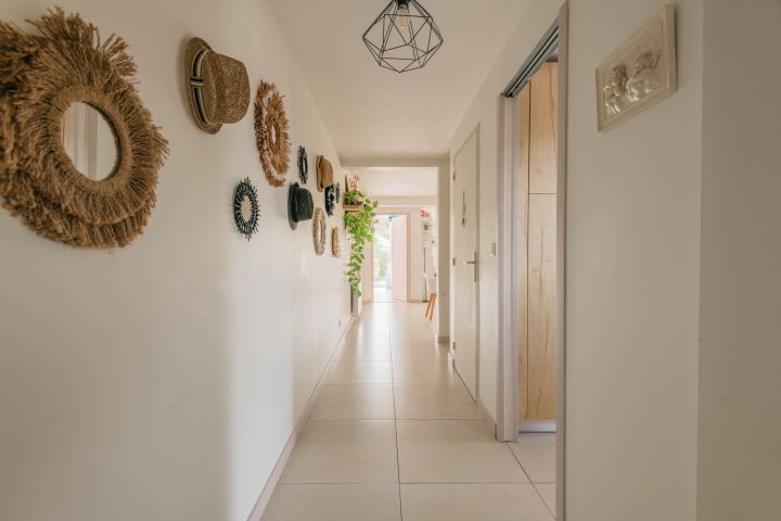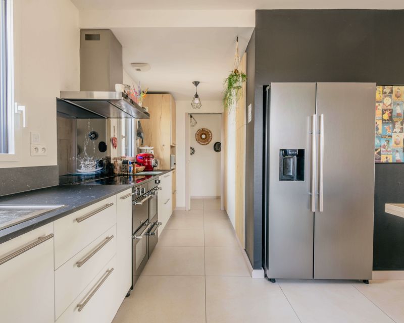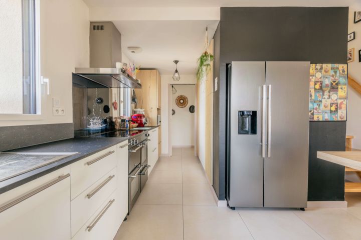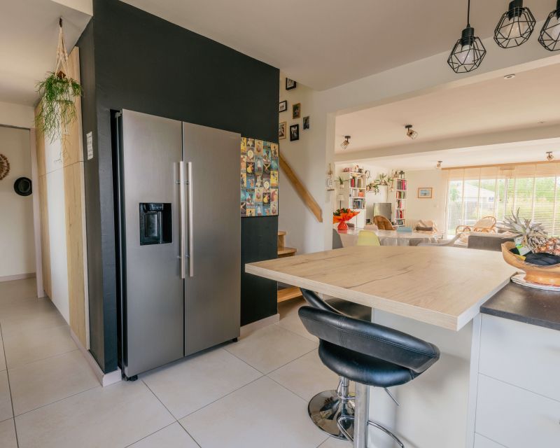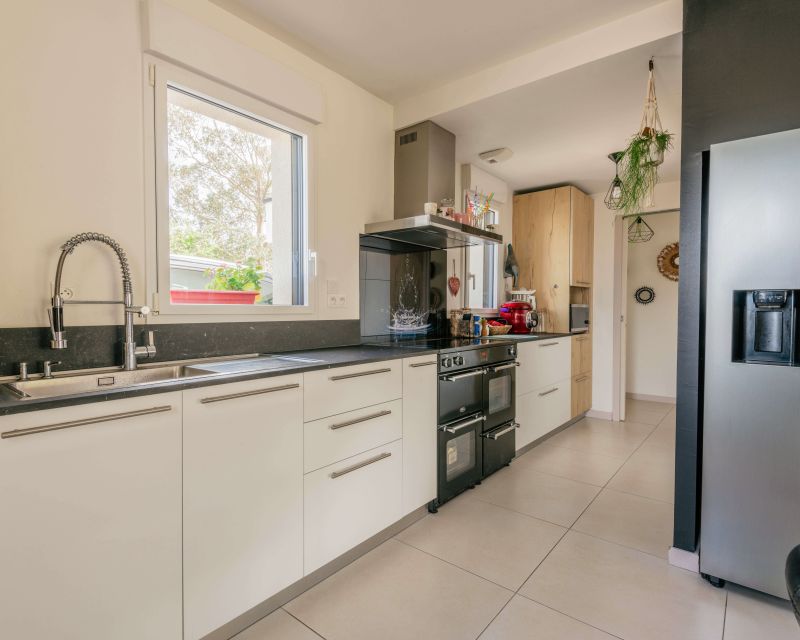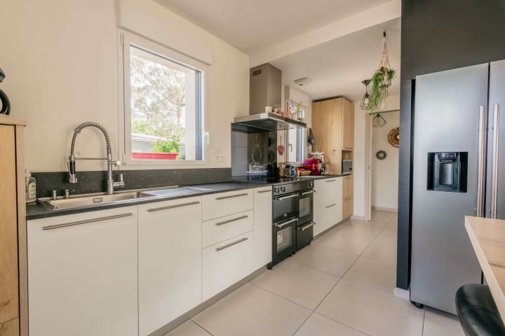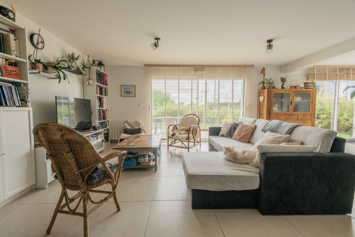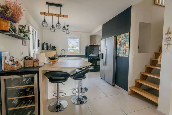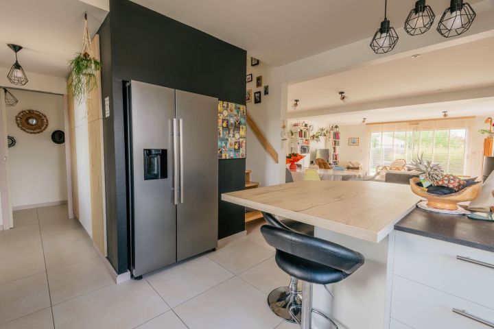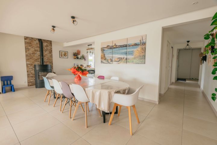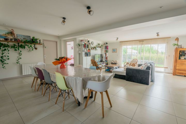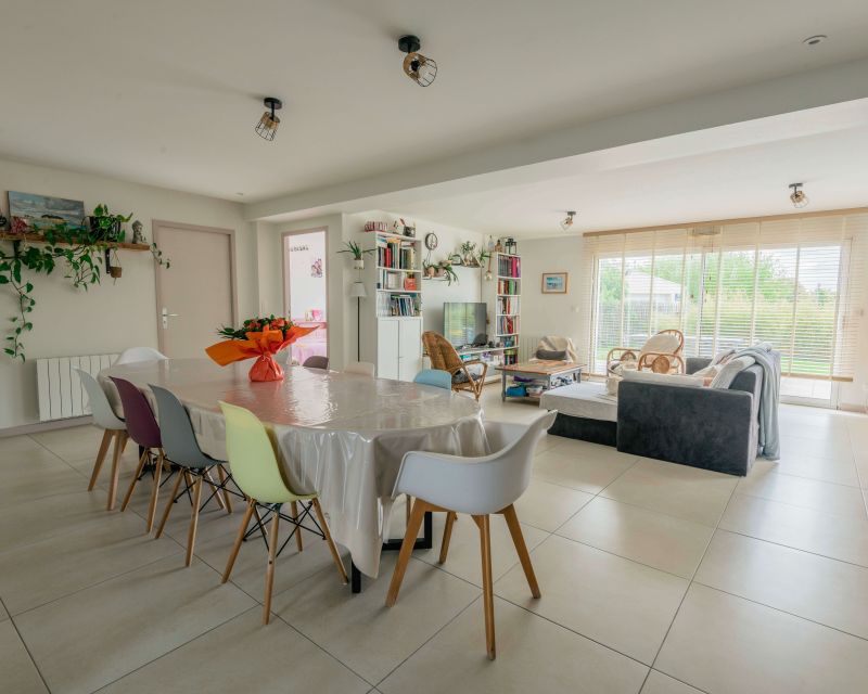 La maison a récemment bénéficié d'une rénovation de qualité, offrant aujourd'hui un cadre de vie confortable et fonctionnel. Une extension du séjour permet de profiter d'un bel espace de vie d'environ 54 m², ouvert sur une grande terrasse exposée plein sud, idéale pour partager des moments conviviaux en extérieur. Le séjour communique avec une cuisine ouverte entièrement aménagée et équipée, ainsi qu'avec une entrée indépendante permettant de préserver une séparation entre les espaces de vie et l'accès principal.
