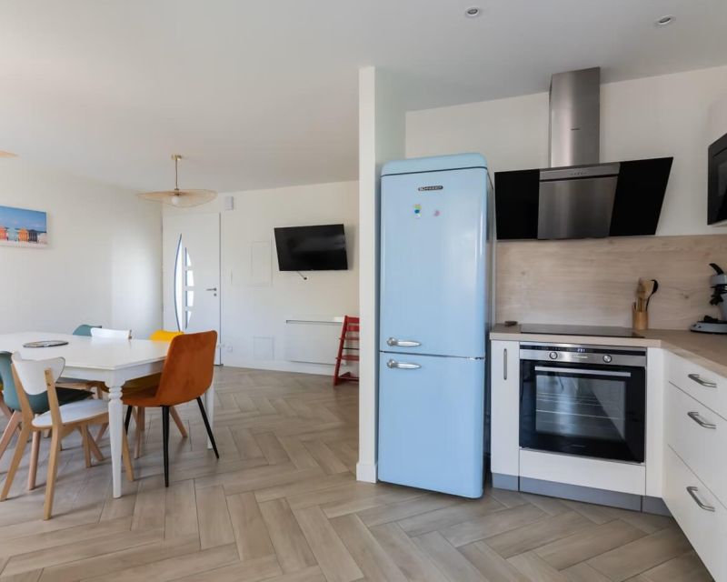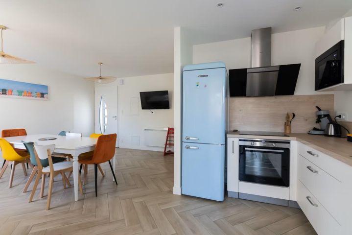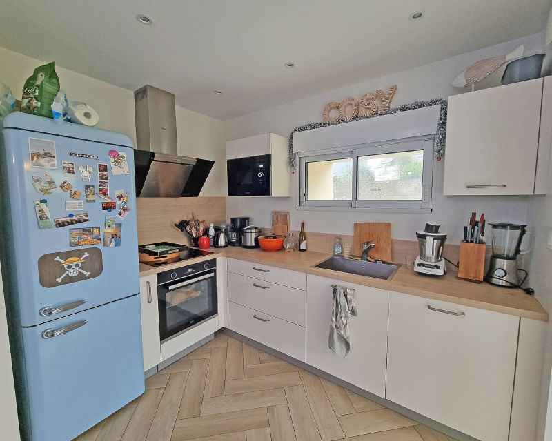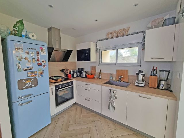 Fonctionnelle et bien agencée, elle comprend une cuisine aménagée ouverte sur le salon-séjour, créant un espace de vie confortable et optimisé.