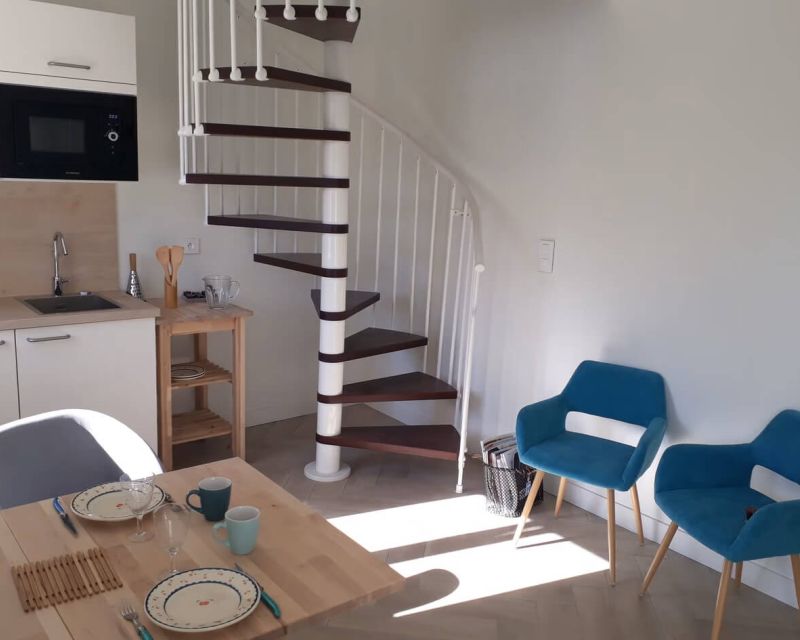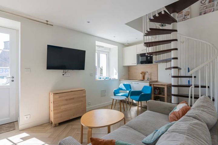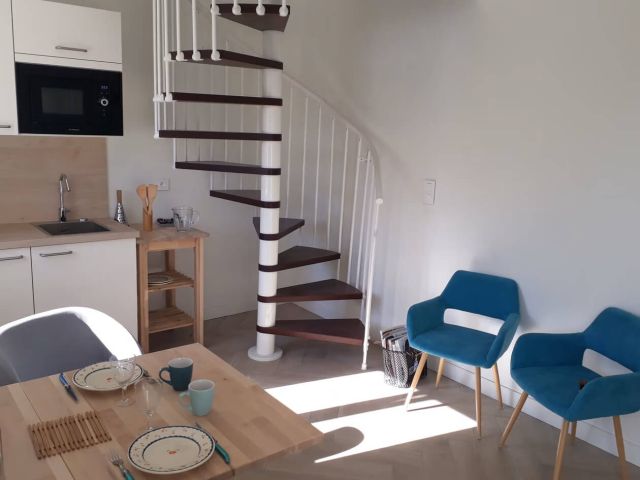Un logement indépendant comprenant un coin cuisine et salon-séjour, et à l'étage, une chambre et une salle de douche-WC.