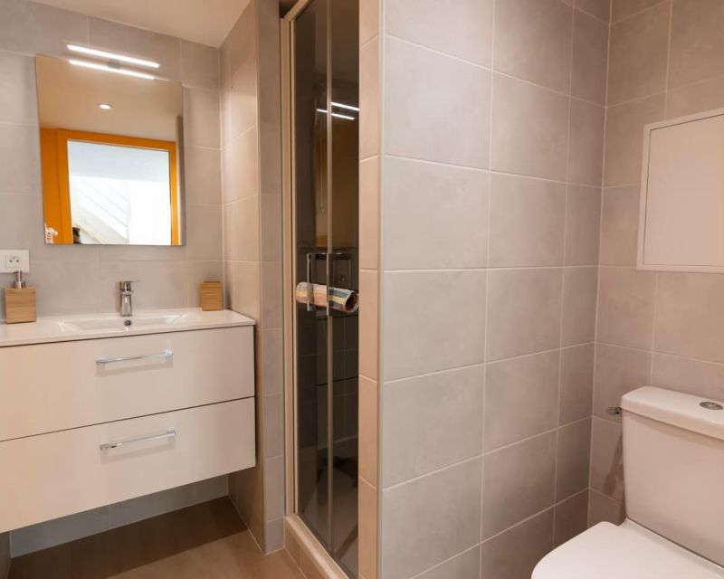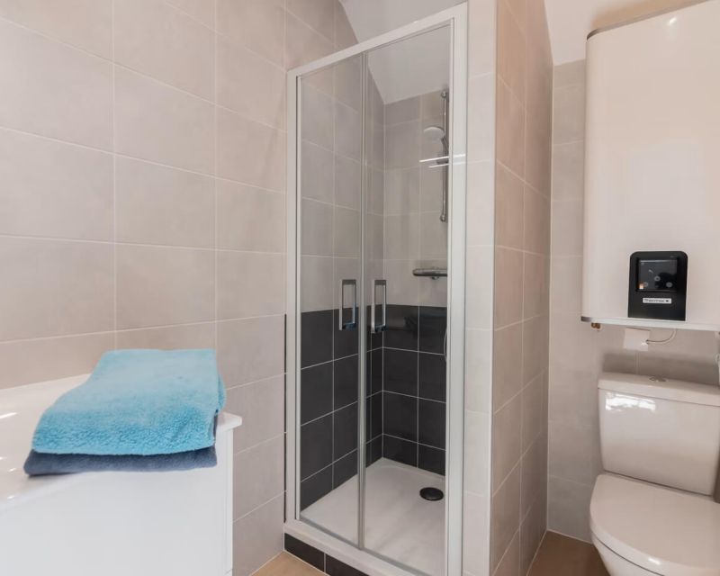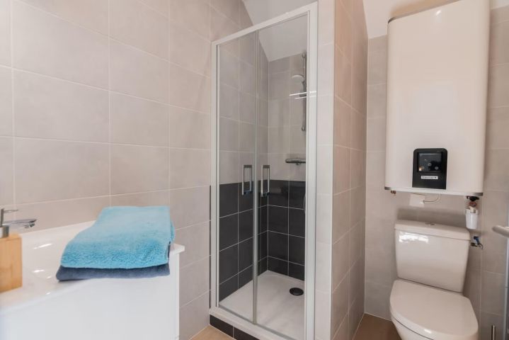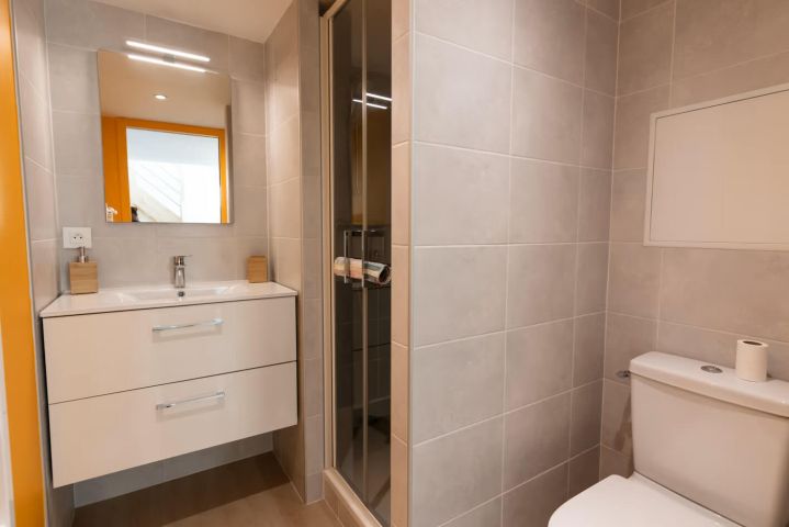 Au 1er étage, vous trouverez une salle de douche confortable avec WC ainsi que deux chambres de 9 m² environ avec chacune un lavabo.
