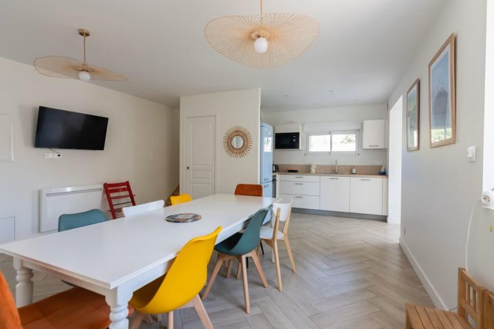 Elle se compose d'une cuisine aménagée ouverte sur un agréable salon-séjour, formant un espace très convivial. Une véranda attenante prolonge la pièce de vie et permet un accès direct aux terrasses extérieures, offrant une belle continuité entre intérieur et extérieur.