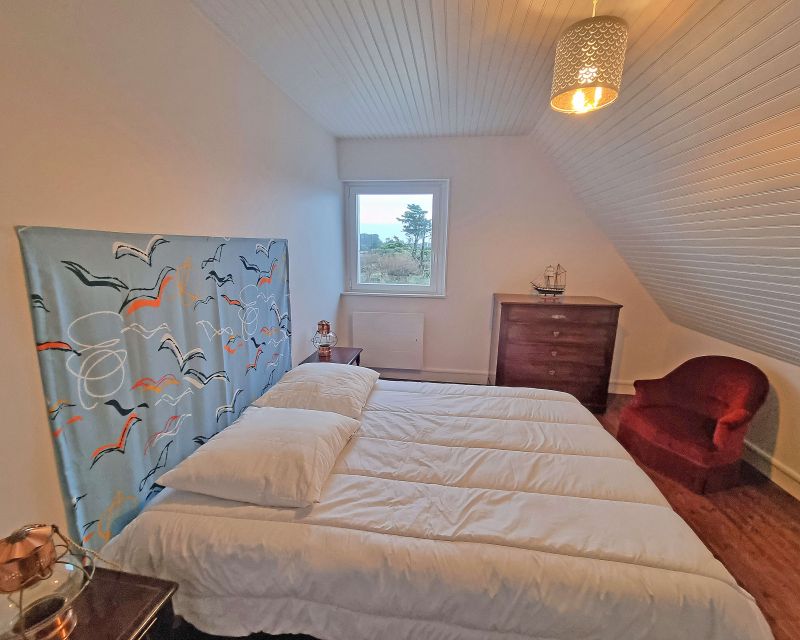 Au rez-de-chaussée, l’ancien garage a été intelligemment aménagé en une confortable chambre offrant une belle vue mer. Une salle de bain ainsi qu’un WC indépendant viennent compléter cet espace.