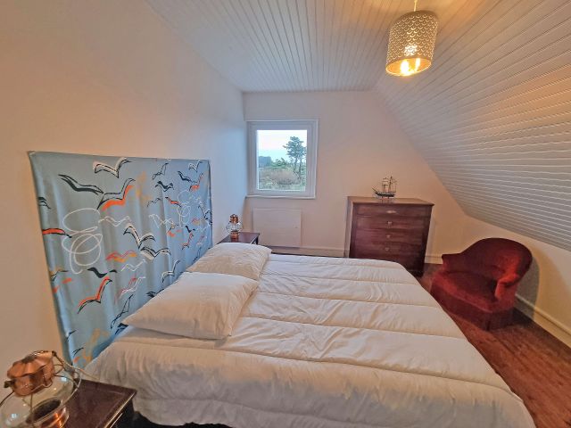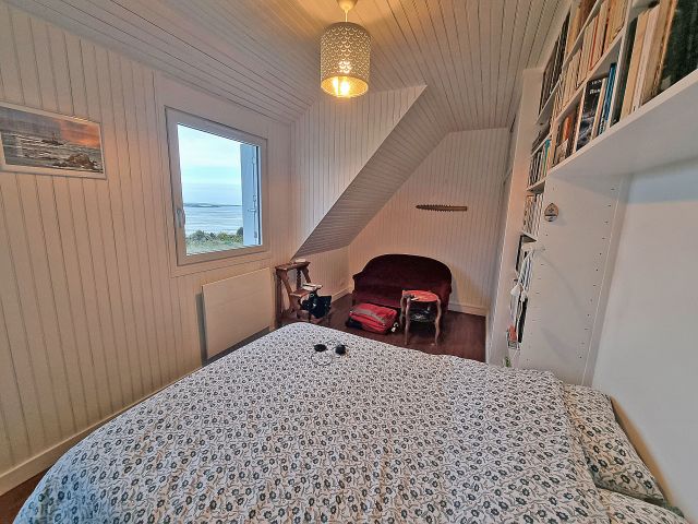À l’étage, trois belles chambres profitent elles aussi d’un spectacle marin permanent. Une quatrième petite chambre ou salle de jeux, accessible par un second escalier, permet d’imaginer un espace enfants ou télétravail. Une salle de bains et des WC complètent ce niveau.