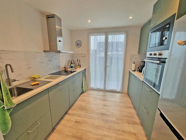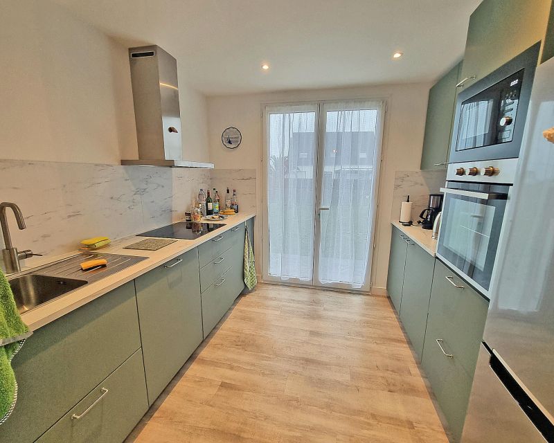 La cuisine, entièrement aménagée et équipée, accueille également un espace salle à manger convivial. Baignée de lumière, cette pièce offre une agréable vue mer grâce à sa baie vitrée.