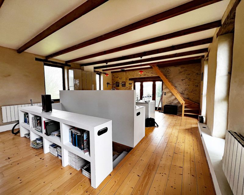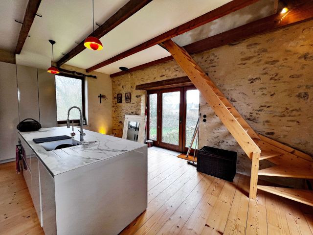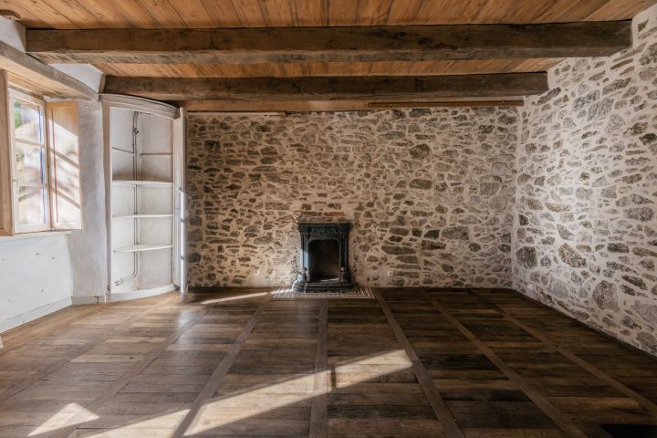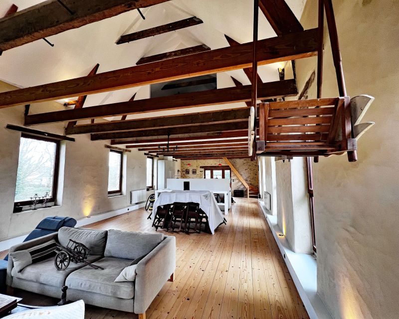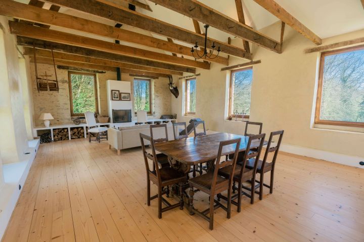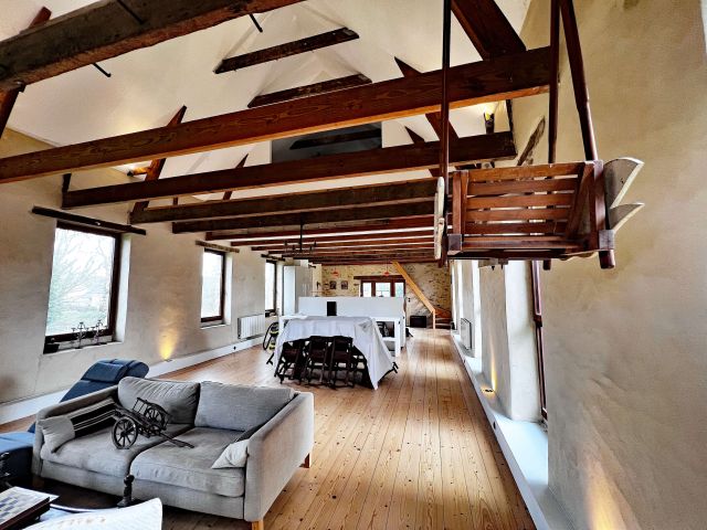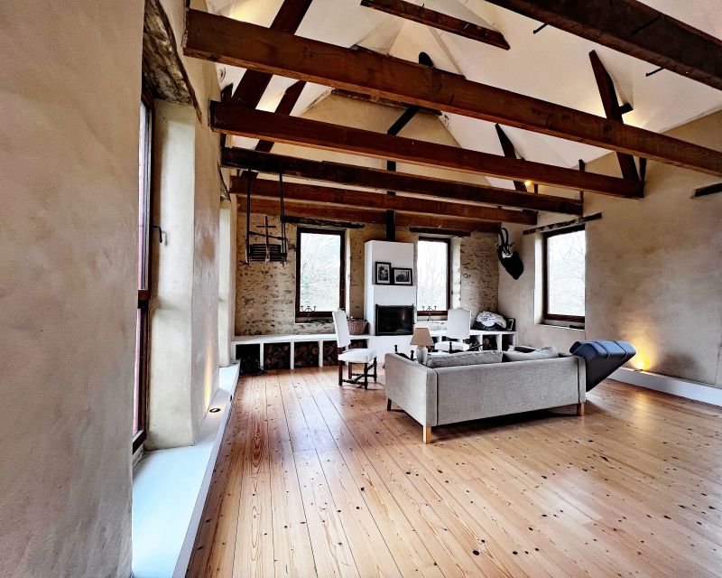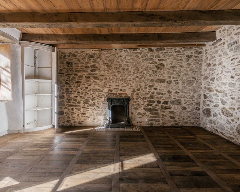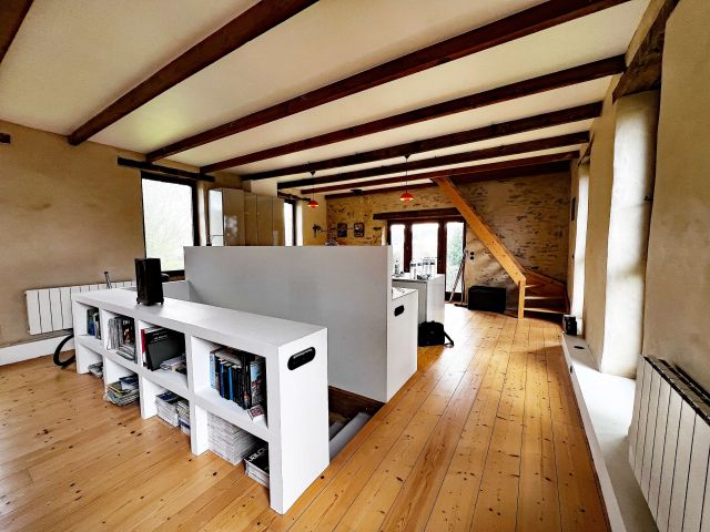 La maison d’habitation historique de 185 m² est composée au rez-de-chaussée en dalles de schiste d’une vaste entrée, d’une cuisine salle à manger, d’un salon, d’une bibliothèque et d’une salle d’eau, au premier étage trois grandes chambres, un bureau et une salle de bains.