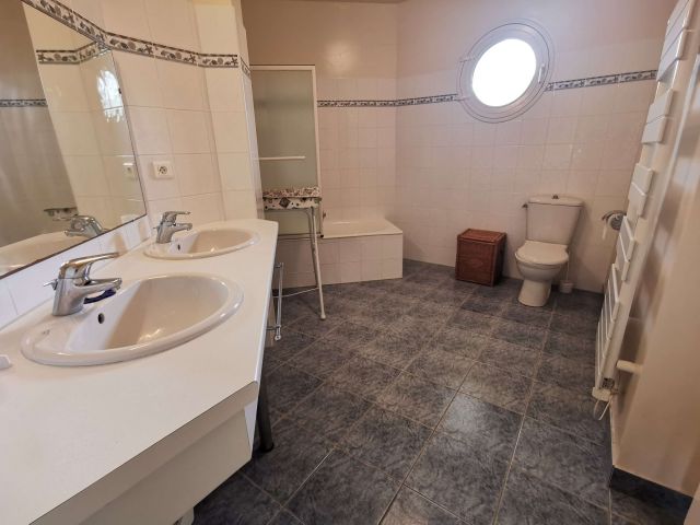 - A l'étage : salle de séjour - salon avec cheminée avec insert, espace ouvert salle à manger - cuisine aménagée et équipée, chambre avec salle de bains-wc donnant accès à deux balcon-terrasses, wc avec lave-mains.