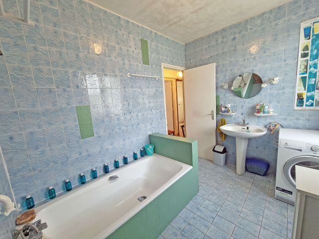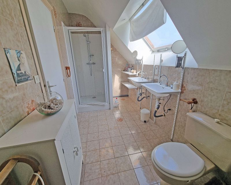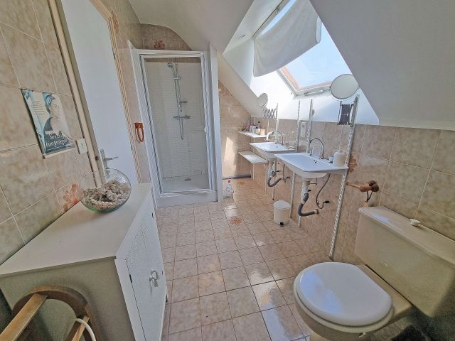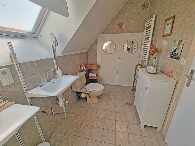 Le rez-de-chaussée accueille également une chambre confortable (environ 14 m2), une salle de bains avec WC, ainsi qu’un espace de rangements. À l’étage, une mezzanine crée un agréable coin lecture ou détente. Trois chambres complètent la partie nuit, accompagnées d’une salle d’eau avec WC et placard.