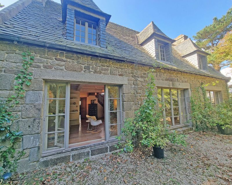 Les grandes baies vitrées en bois offrent une luminosité exceptionnelle dans le salon-séjour, tandis que la belle toiture en ardoises de Carhaix ajoute du charme à l'ensemble.