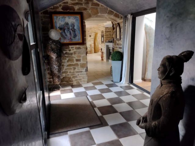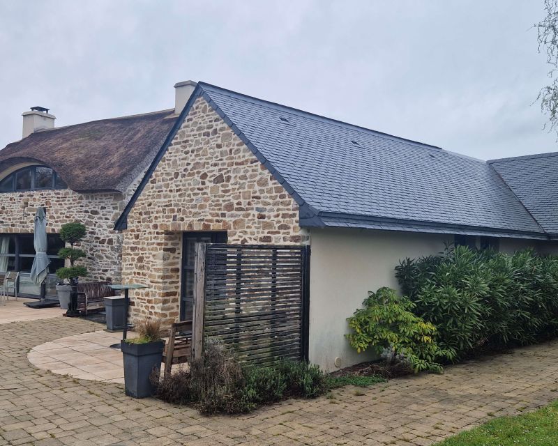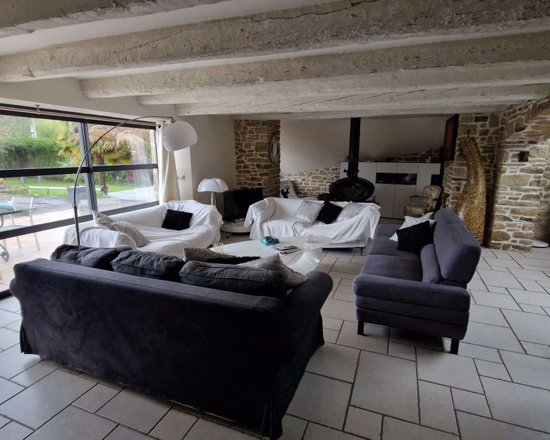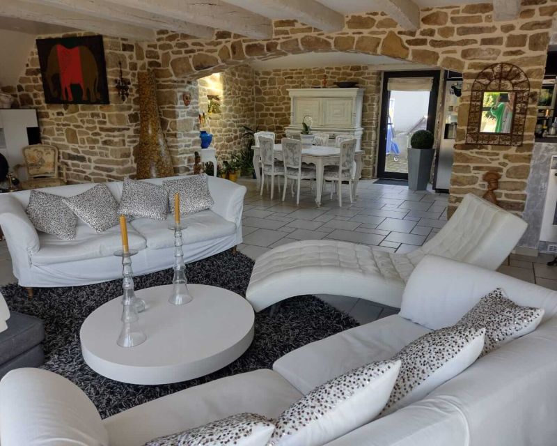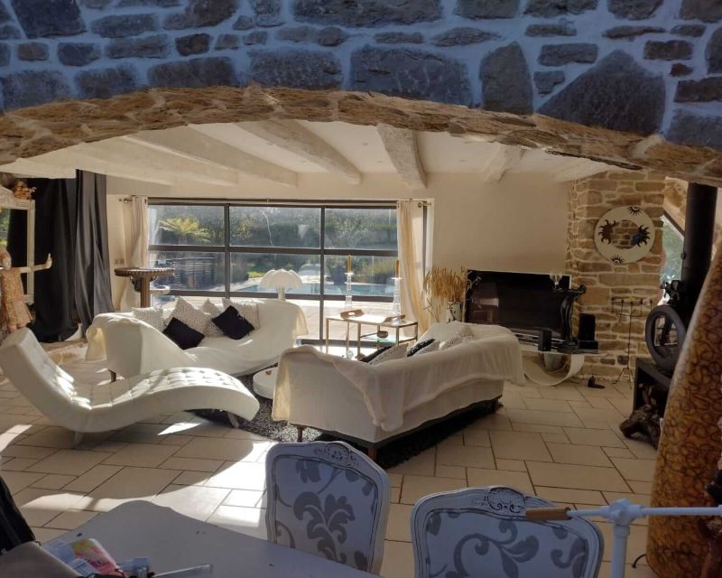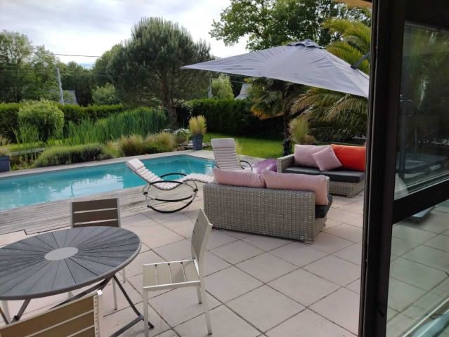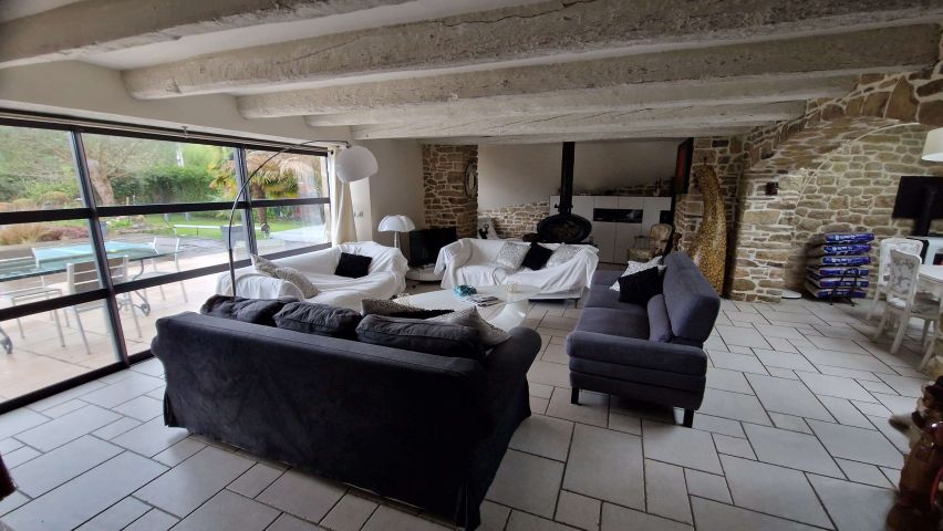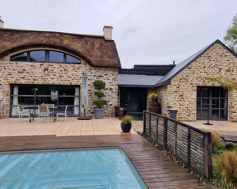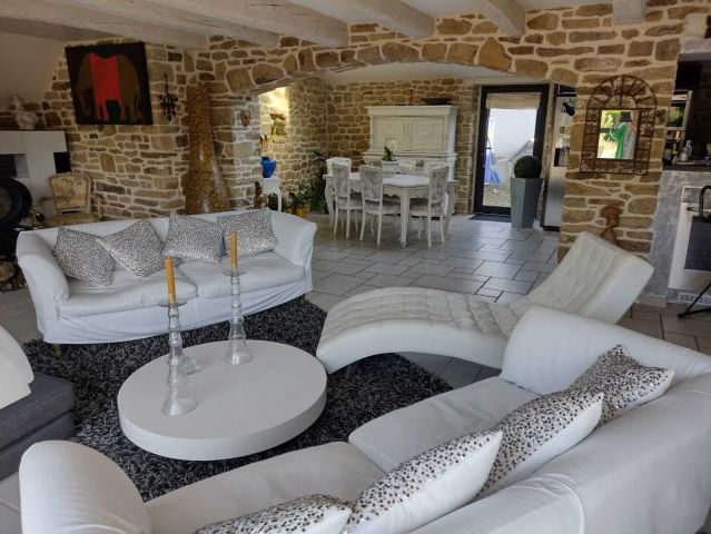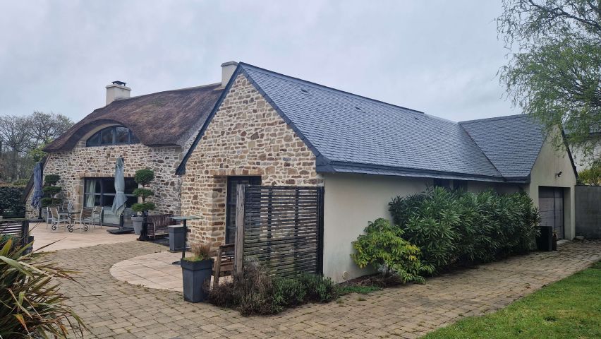 BADEN - Au coeur du golfe du Morbihan et à deux pas du parcours de golf de Baden, au calme et sans vis à vis, belle propriété en pierres sous toiture en chaume, exposée au Sud-Ouest, d'une surface de 180 m² environ, édifiée sur un terrain clos paysagé de plus de 1300 m², avec bassins à carpes, piscine, oliviers... Destinée à de futurs privilégiés.